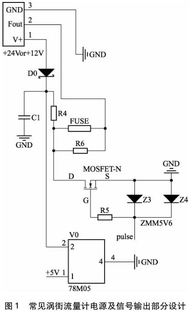 從圖1 中可以看到,供電電源 +24 V, +12 V均可,直流電源通過瓷片電容 C1 濾掉部分紋波,然后通過線性穩(wěn)壓芯片 78M05,得到 + 5 V 電壓,為后面的飽和蒸汽流量表信號(hào)處理電路供電,若要再得到 3. 3 V 電壓,通常會(huì)在 78M05 后再加一片線性穩(wěn)壓芯片 LM1117-3. 3,為了節(jié)約成本,供電電路沒有做 EMS 設(shè)計(jì)。同時(shí),脈沖輸出部分,僅通過一個(gè) MOS 管和兩個(gè)穩(wěn)壓管,也沒有 EMS 方面的設(shè)計(jì)考慮。