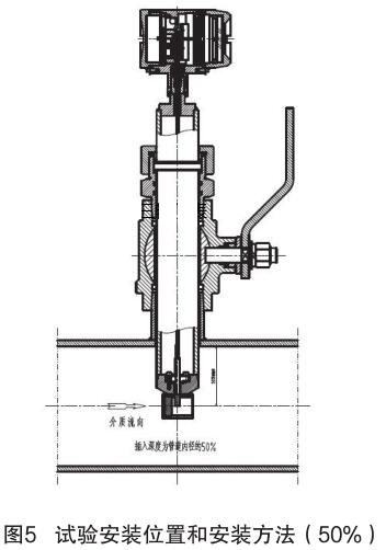對(duì)插入式蒸汽計(jì)量表和插入式電磁流量計(jì)的結(jié)構(gòu)原理進(jìn)行分析,插入式電磁流量計(jì)的信號(hào)采集點(diǎn)在標(biāo)校管道內(nèi)12.5% 為宜,因它屬電磁類流量計(jì),而蒸汽計(jì)量表是根據(jù)“卡門渦街”原理進(jìn)行測(cè)量管道內(nèi)流量,根據(jù)標(biāo)校管道內(nèi)層流和湍流的分析,以及插入式蒸汽計(jì)量表獨(dú)特的探頭結(jié)構(gòu)形式,確定插入式蒸汽計(jì)量表的插入深度為標(biāo)校管道內(nèi) 50%,試驗(yàn)安裝位置和安裝方法如圖 5 所示。