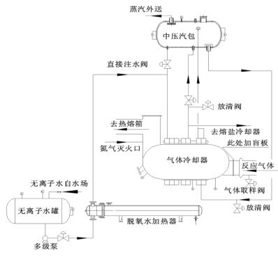 來(lái)自無(wú)離子水罐的脫氧水經(jīng)多經(jīng)泵加壓、經(jīng)脫氧水加熱器加熱后進(jìn)入到壓縮空氣計(jì)量表的水段,脫氧水與反應(yīng)氣體換熱后分兩路:一路進(jìn)入中壓汽包,保證汽包有穩(wěn)定的液位;一路進(jìn)入熔鹽冷卻器帶出熔鹽攜帶的反應(yīng)熱。來(lái)自中壓汽包的高溫水經(jīng)管路接至壓縮空氣計(jì)量表汽段底部,高溫水與反應(yīng)氣體換熱后產(chǎn)生高壓蒸汽,高壓蒸汽又返回中壓汽包。汽包還有一路直接注水管路,此路水不經(jīng)過(guò)壓縮空氣計(jì)量表水段,而是直接進(jìn)入汽包。在壓縮空氣計(jì)量表出口溫度偏低而汽包液位也比較低時(shí),可開(kāi)此直接注水管路來(lái)穩(wěn)定汽包液位。其詳細(xì)流程圖如圖 2。