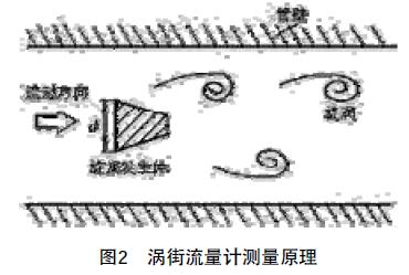 在流體中設(shè)置旋渦發(fā)生體,則從旋渦兩側(cè)交替產(chǎn)生有規(guī)則的旋渦,這種旋渦稱為卡門旋渦,如圖2所示,旋渦列在旋渦發(fā)生體下游非對稱地排列。旋渦流量計是根據(jù)卡門渦街原理測量氣體、蒸汽或液體的體積流量、標(biāo)況的體積流量或質(zhì)量流量的體積流量計。并可作為流量變送器應(yīng)用與自動化控制系統(tǒng)中。