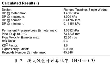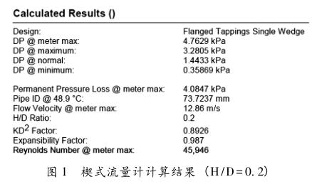 (4)根據(jù)工藝要求及現(xiàn)場安裝環(huán)境選擇耐壓、耐溫等級、防護(hù)等級、防爆等級、輸出信號等。3測量熱解氣的渦街流量計的選型設(shè)計熱解氣的組分如表1所述,其工藝參數(shù):操作密度0.63kg/m3,運動粘度2×10-5m2/s,操作溫度48.9℃,操作壓力7.5kPa,管道DN80,*小流量50Nm3/h,正常流量100Nm3/h,*大流量150Nm3/h,儀表測量范圍選擇0~180Nm3/h。因為本裝置為試驗裝置,在裝置運行的過程中,業(yè)主可能會根據(jù)需要適當(dāng)調(diào)整參數(shù),因此選擇量程比寬一些的流量計會有助于調(diào)整后的測量;另外熱解氣作為產(chǎn)品之一,其流量是驗證工藝與關(guān)鍵設(shè)備的工程可行性、優(yōu)化工藝參數(shù)的關(guān)鍵參數(shù)之一,因此使用精度高一些的流量計也是有必要的;熱解氣的組分隨著參數(shù)的調(diào)整也可能會發(fā)生變化,因此基于伯努利方程原理的,如孔板、噴嘴、阿牛巴、德爾塔巴、平衡式等都不能很好的測量,因為這類流量計受流體物性(密度、粘度)和組分變化影響,且*終的熱解氣產(chǎn)品或多或少都有焦油的存在,時間長了可能堵塞流量計。楔式流量計帶自清潔的功能,如果采用法蘭取壓,變送器采用隔膜密封式變送器,其受焦油的影響較小,楔式流量計的計算結(jié)果分別見圖1和圖2。
