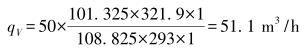 式中,qV、qn分別為工作狀態(tài)和標(biāo)準(zhǔn)狀態(tài)下的體積流量,m3/h;P、Pn分別為工作狀態(tài)和標(biāo)準(zhǔn)狀態(tài)下的絕對壓力,Pa;T、Tn分別為工作狀態(tài)和標(biāo)準(zhǔn)狀態(tài)下的熱力學(xué)溫度,K。