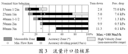從圖3可見,出流量計口徑為DN80時,*小流量無法測量;流量計口徑縮徑至DN50時,*小流量可測(此時流體的雷諾數(shù)非常接近2×104),但此時的測量精度稍微差些;流量計口徑縮徑至DN40時,*小流量可測,且精度也能得到保證。用上述公式計算的壓損與軟件計算出來的也基本一致,差別來自計算時流速及流量計口徑均采用的是估算值。如果流量計縮徑至DN25時,流量計的壓損已經(jīng)達(dá)到7.6kPa,壓損較大,無法滿足工藝要求。因此選擇DN40口徑的流量計能滿足要求。對于DN50口徑的方案,如果流量大于54Nm3/h時,流量計的精度為此款流量計的*佳精度,為1.0%,當(dāng)流量為50Nm3/h時,此時流量可測,只是精度稍差些,約為1.81%,但流量計的壓損會小很多,從節(jié)能降耗方面考慮,選擇DN50口徑的流量計也是可以的。綜上,選擇DN40和DN50口徑的渦街流量計都能滿足要求。