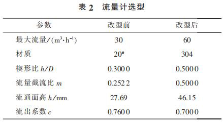 2) 為了解決泵出口流量計(jì)頻繁泄漏以及流量較低不能滿足工藝需求的問題,更換新型流量計(jì),其相關(guān)參數(shù)見表 2。 更換后的流量計(jì)運(yùn)行 4 000 h后未出現(xiàn)泄漏現(xiàn)象。