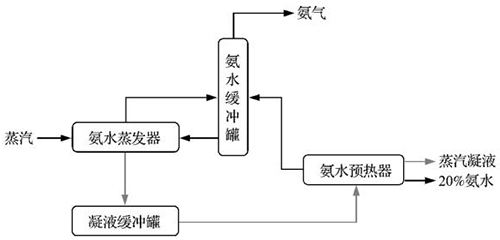 氨水在20kPa壓力下的蒸發(fā)溫度為118℃,此溫度為飽和溫度,當(dāng)溫度稍微降低時,氨氣就會冷凝為液體。為了使氨氣在輸送過程中不易冷凝,采用過熱氨氣的輸送方式。方法是使氨水在20kPa壓力下蒸發(fā)(此時氨水的蒸發(fā)溫度為118℃),之后通過壓力控制閥使之減壓到10kPa,此時氨氣溫度為110℃,遠(yuǎn)大于飽和溫度,氨氣不易冷凝。氨水緩沖罐的壓力控制采用單回路簡單控制,安裝在氨水緩沖罐上部的壓力傳感器設(shè)定在20kPa,當(dāng)壓力升高或降低時,調(diào)節(jié)閥動作,使氨水緩沖罐的壓力保持在20kPa。