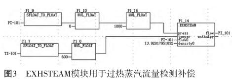 其中COMPENSATE模塊適用于溫度為260~800℃,壓力(絕壓)為0.5~32MPa的工況;而EXHSTEAM模塊適用于溫度為140~560℃,壓力(表壓)為98.6777~15898.6777kPa的工況。假設(shè)過(guò)熱蒸汽的設(shè)計(jì)壓力為4MPa(表壓),設(shè)計(jì)溫度為400℃;過(guò)熱蒸汽的實(shí)測(cè)壓力為PI-101:0~6MPa(表壓),實(shí)測(cè)溫度為T(mén)I-101:0~600℃,流量為FI-101,補(bǔ)償后的流量為FI_101,經(jīng)EXHSTEAM過(guò)熱蒸汽特性計(jì)算得出設(shè)計(jì)密度為13.92817951832kg/m³,則DCS圖形化編程如圖3所示。