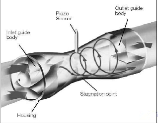旋進漩渦流量計的原理:旋進旋渦流量計是在文丘里管的前面加了一個起旋器,產(chǎn)生一次漩渦,再經(jīng)過文丘里管產(chǎn)生二次漩渦,二次漩渦的漩渦頻率與流體流速成正比
