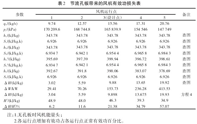 孔板節(jié)流引起風(fēng)機(jī)消耗有效功增加,具體計(jì)算結(jié)果見(jiàn)表2。