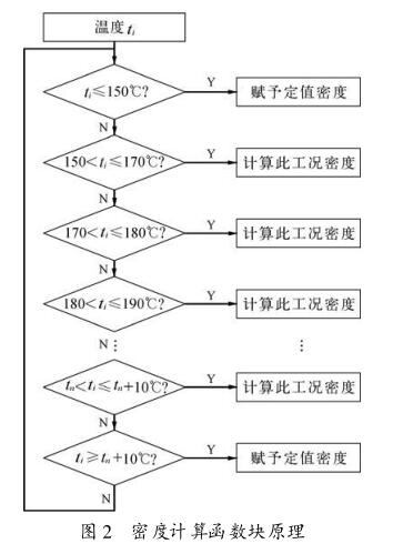 定義密度計(jì)算程序是蒸汽壓力0.4~0.5MPa的一個(gè)函數(shù),以相同的方法定義0.5~0.6MPa,0.6~0.7MPa,一直到0.9~1MPa等若干個(gè)函數(shù),這里不再重復(fù)。通過對(duì)壓力值范圍的判斷調(diào)用相應(yīng)的函數(shù),就可以得到較為準(zhǔn)確的密度值。程序框圖如圖1,圖2所示,pi為蒸汽壓力,ti為蒸汽溫度。
