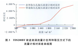 例,系統(tǒng)運(yùn)行時(shí)間為60s,標(biāo)準(zhǔn)裝置的滯止平均溫度為29.7℃,空間平均濕度為42%,流量計(jì)的平均溫度為29.3℃,在表體取壓孔取壓和管道取壓孔取壓的流量計(jì)檢定試驗(yàn)數(shù)據(jù)分別如表3、4所示。兩種取壓方式下的流量計(jì)相對(duì)誤差曲線如圖3所示。
